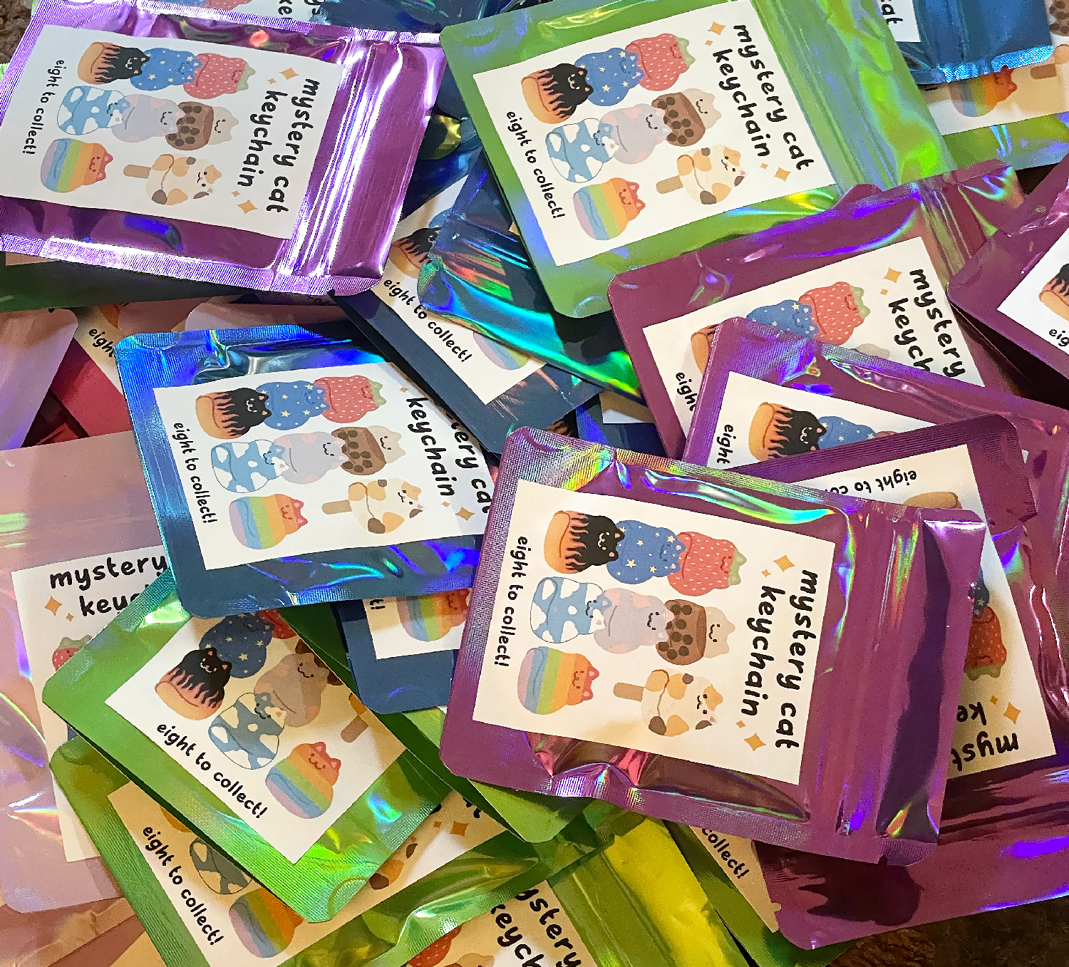 These cat shaped keychains come in an opaque bag, so you won't know which one you will get until you open the blind bag.