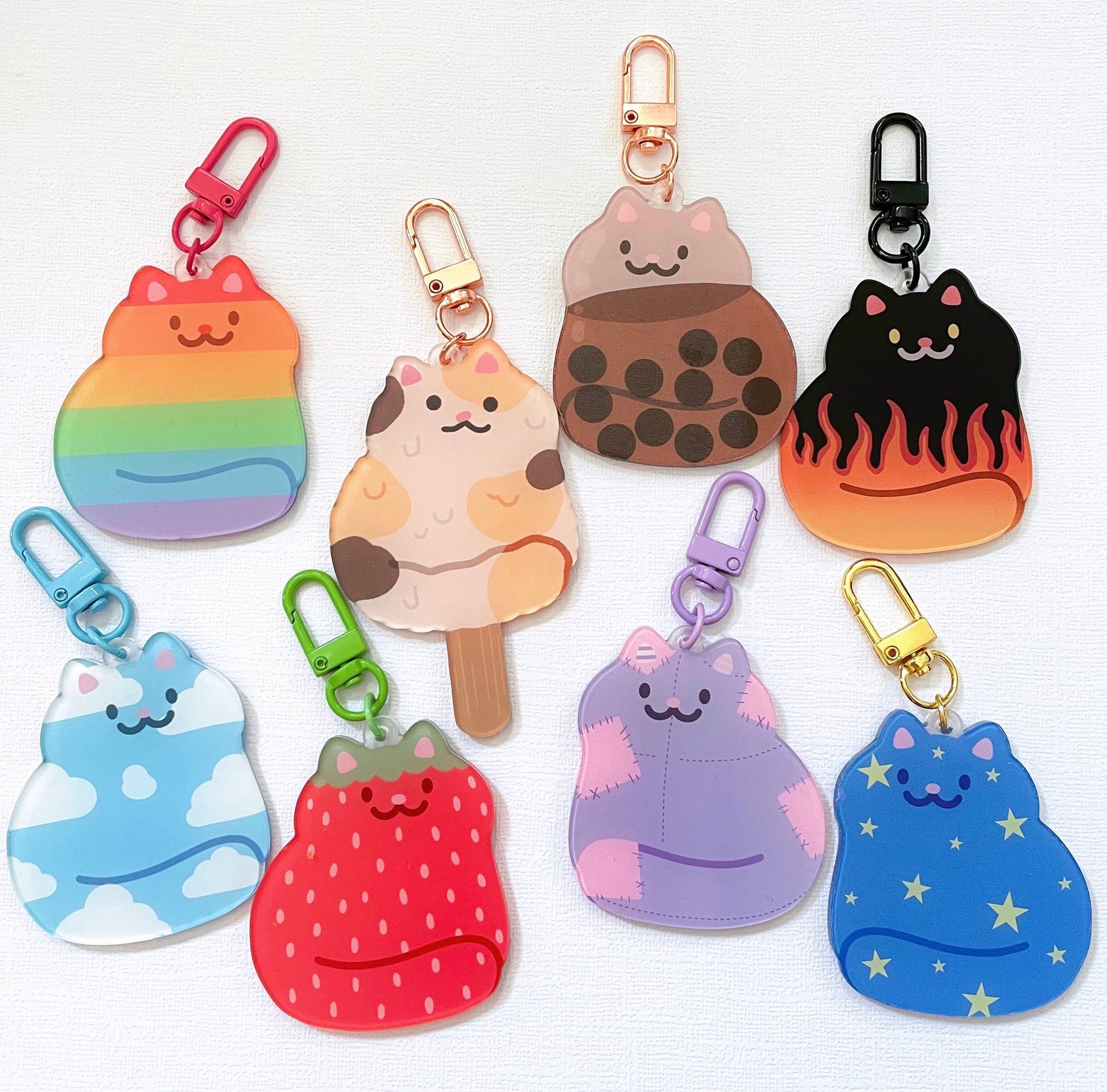 There are eight cute designs to collect: Strawberry Cat, Boba tea cat, Wonky Ice cream cat, Plush toy cat, Cool flames cat, Rainbow cat, Starry cat, and Cloud cat